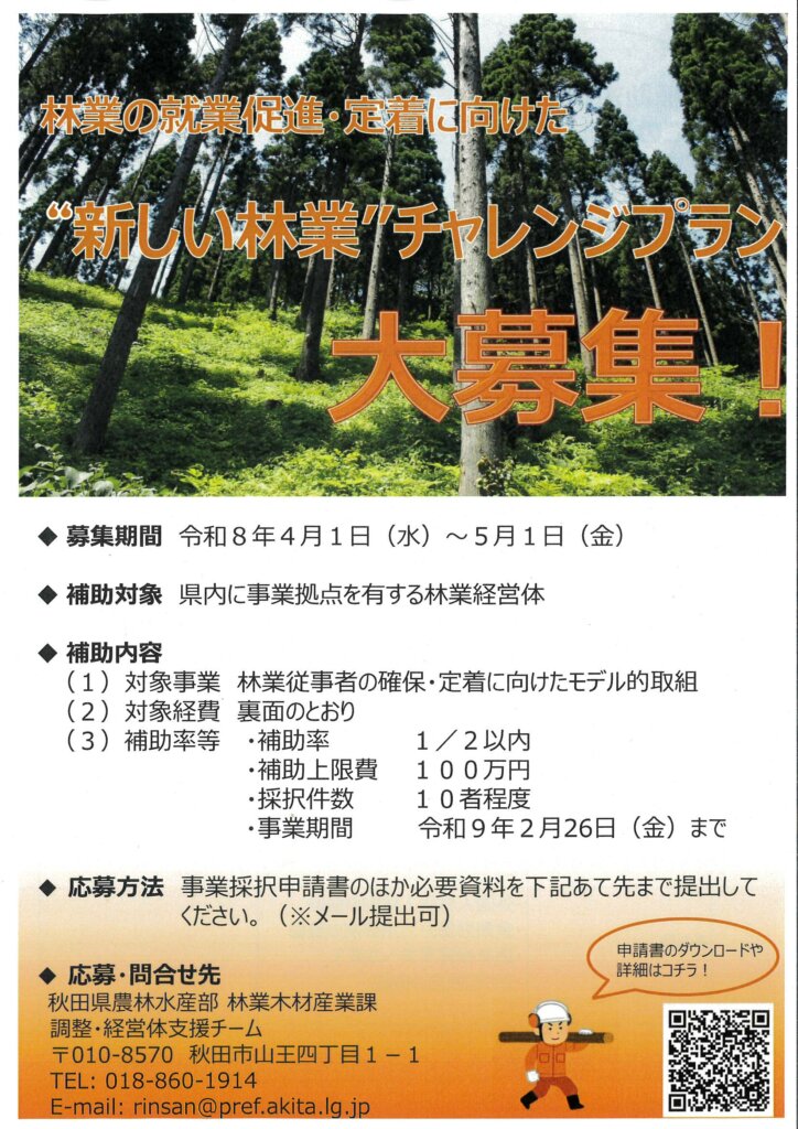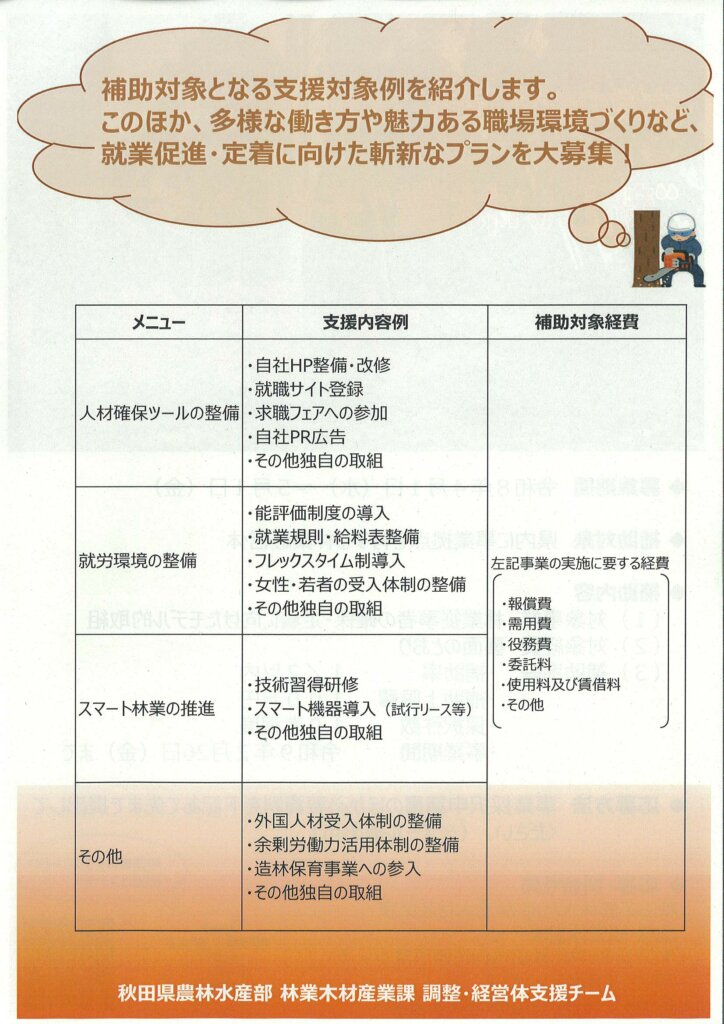 林業従事者の確保ならびに定着に向けて、多様な働き方や就労環境の整備により、モデルとなる取組(チャレンジプラン)を実施し、魅力ある職場環境の創出など、“新しい林業”を実践する意欲的な林業経営体を支援します。(秋田県の補助事業です。)